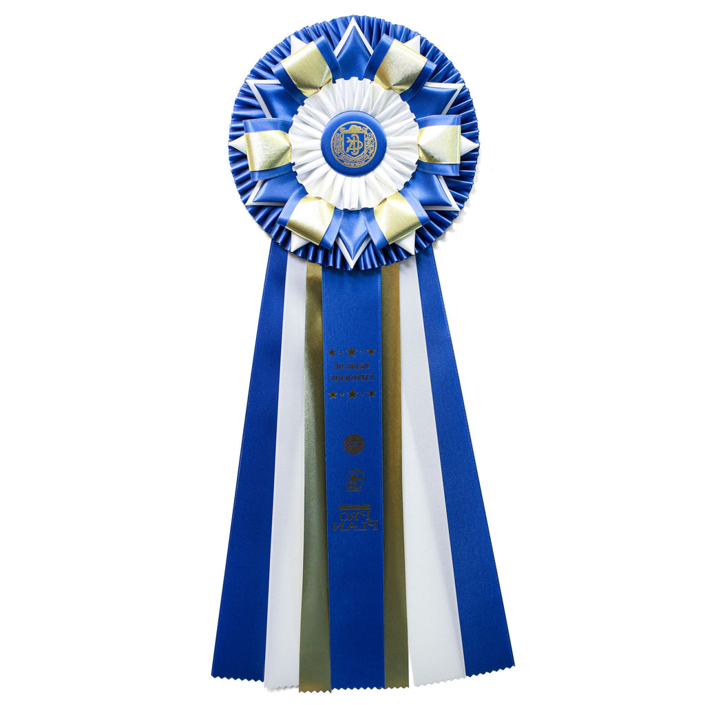 Our KL718 is an extraordinary Grand Imperial Rosette, representing a monumental achievement in both design and recognition. Its immense 8½” head is a breathtaking work of art, featuring an inner pleat, six soft petals, and a brilliant halo of eighteen sharp, flat points. Complemented by a majestic body of seven extra-long, 18” streamers, this is a truly magnificent award designed to be an unforgettable centrepiece for the most prestigious occasions.