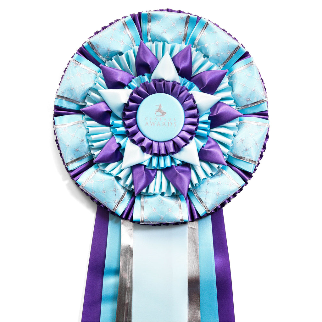 Our 8T-7 is The Grand Masterpiece Rosette, an unparalleled work of art and the absolute pinnacle of our collection. Its immense 9¾” head is a breathtaking feat of craftsmanship, featuring an incredible five layers of inner pleats, middle pleats, ten soft petals, and fifteen sharp, pinched points. Complemented by a majestic cascade of seven extra-long, 24” streamers, this is a monumental award reserved for a singular, historic achievement—a trophy in ribbon form.
